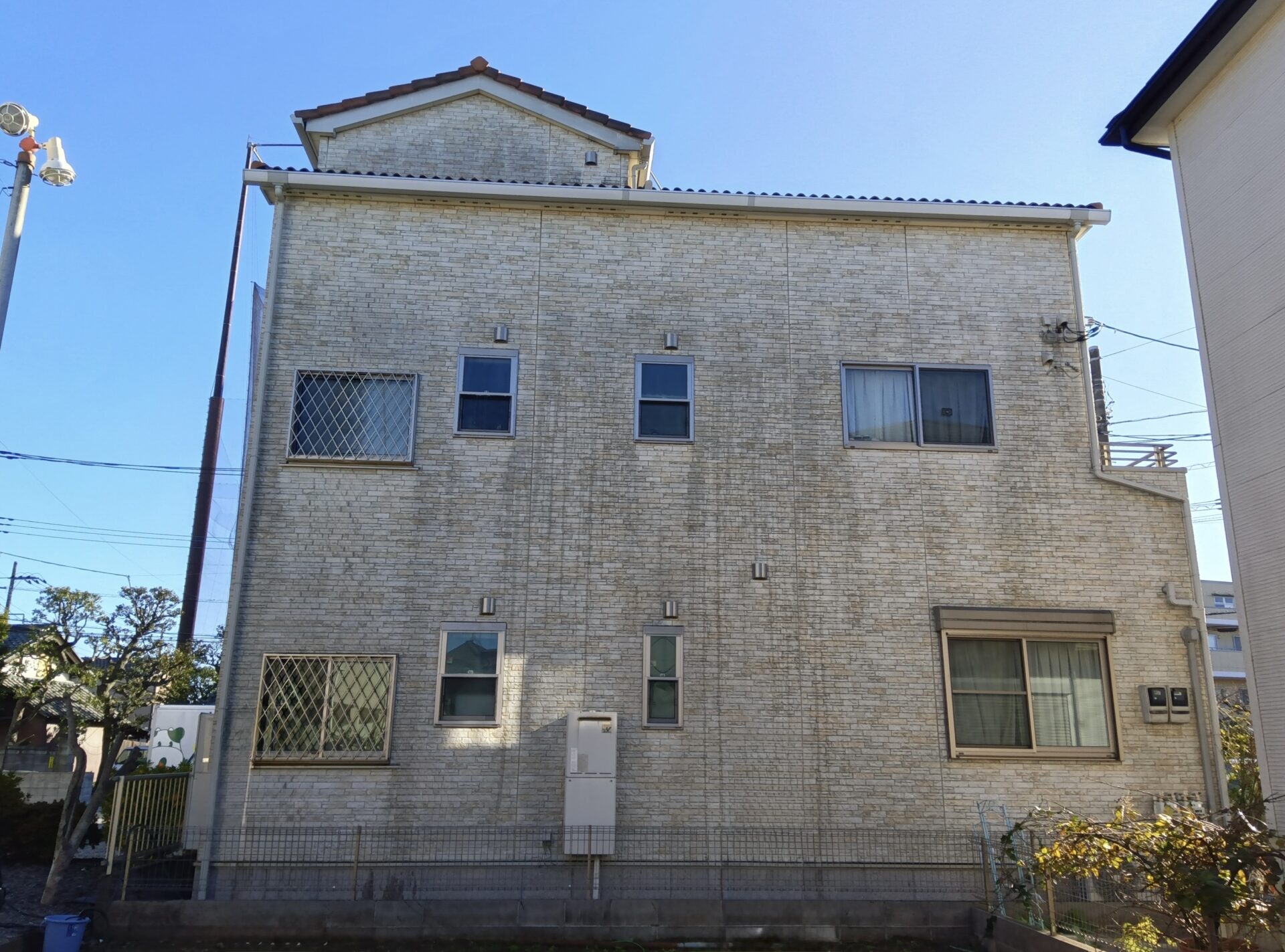 専用ポールブラシで足場なしの安心洗浄。ご近所への配慮もしっかり行います!