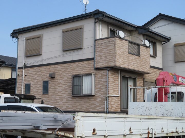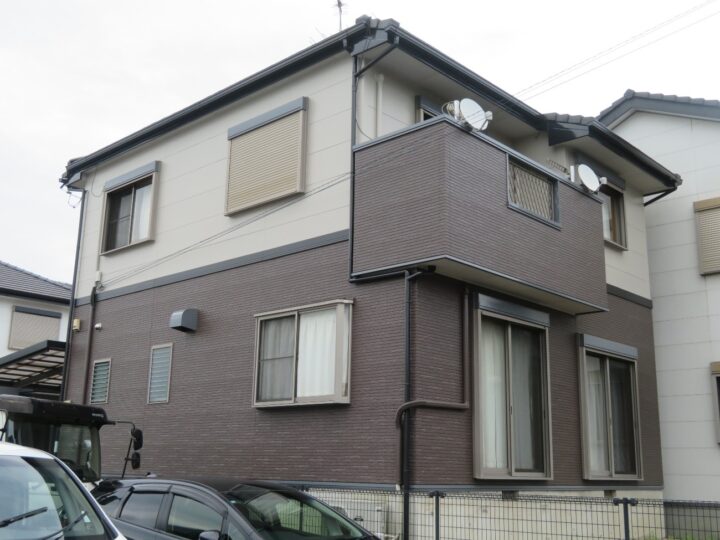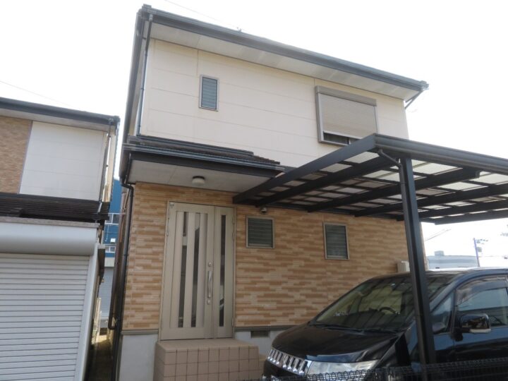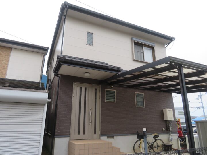 | 使用材料 | 関西ペイント/アレスダイナミックトップ(外壁)/調色 関西ペイント/アレスセラマイルド(軒天)/P19-70A 関西ペイント/パワーMシリコンEX(付帯部)/PN-45 関西ペイント/アレスダイナミックトップマイルド(付帯部)/LN-20 オート化学工業/オートンイクシード(シーリング材) |