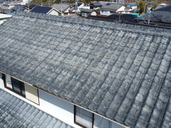 ドローンで屋根を確認させていただいたところ、色褪せや塗膜の劣化がかなり目立ち、塗装での保護が低下している状態でした。