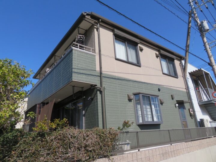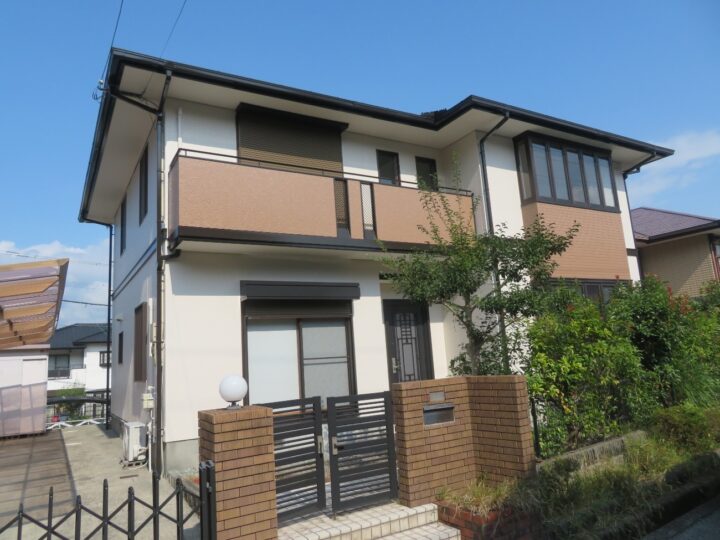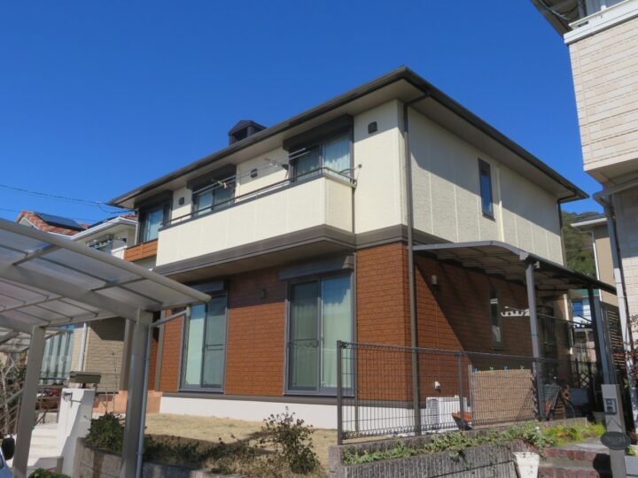 | 使用材料 | エーエスペイント/Sun瓦Xトップ(屋根)/わっぜシルバーブラック 日本ペイント/パーフェクトトップ(外壁)/ND-376 関西ペイント/ムシヨケクリーンカラー(軒天)/JN-90 関西ペイント/パワーMシリコンEX(付帯部)/JN-25 オート化学工業/オートンイクシード(シーリング材) |